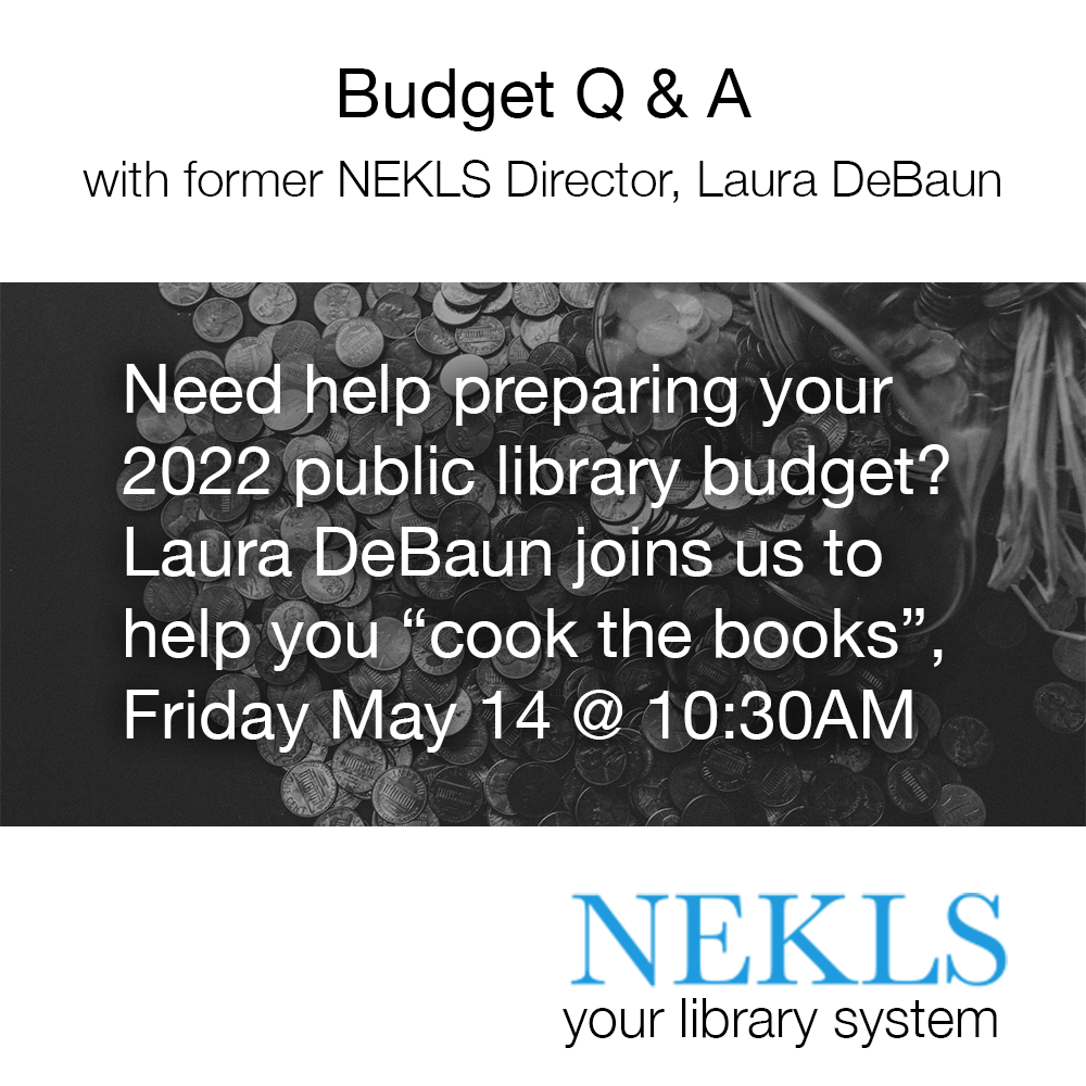 Join us on Zoom, as we welcome former NEKLS Director, Laura DeBaun to help answer any 2022 public library budgeting questions you have in Northeast Kansas; Laura is known for her knowledge of budgets, particularly in the state of Kansas. The Q and A starts at 10:30 AM, but stop by anytime until 11:30 with your questions, no registration is required, the Zoom link is below. Due to the individualized nature of this online work session, it will not be recorded. If you cannot attend, send your questions to Dan Alexander, dalexander@nekls.org, to have them addressed by Laura. Some public libraries might find that the previously recorded budgeting workshops will be helpful as they prepare the 2022 budget, links below.
