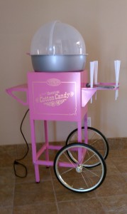 We’ll send along an instruction booklet that details how to use the machine and clean up afterwards. NEKLS will supply paper cones on a cost-recovery basis (about 3 cents each). You can purchase special “flossing sugar” to use in this machine, but regular granulated sugar can also be used, with KoolAid powder added for flavor and color. Other ingredients might damage the machine, so please don’t experiment!