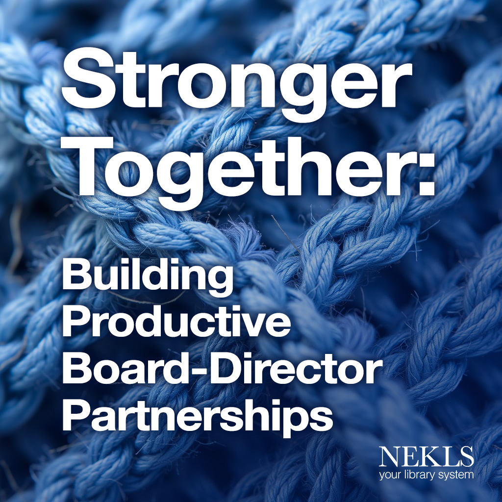 NEKLS Member Public Library Trustees and Directors: Join us Saturday, June 7, 2025, from 9:30–11:00 a.m. CDT on Zoom for this year’s NEKLS Trustee Training. This session, presented by Nicolle Davies, Colorado State Librarian, will explore the essential relationship between library boards and directors, providing practical strategies for fostering collaboration, improving communication, and strengthening partnerships that drive library success.