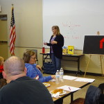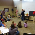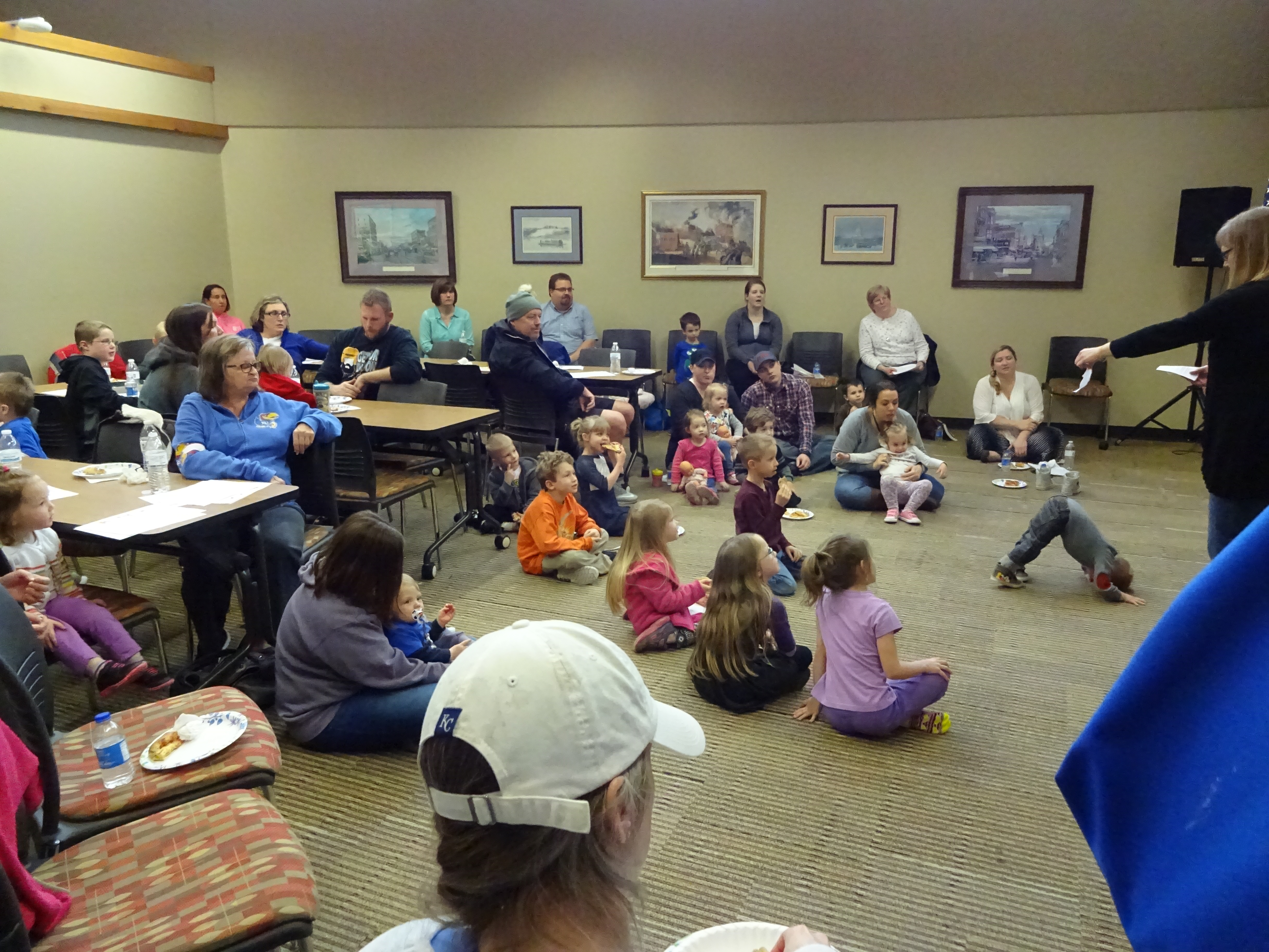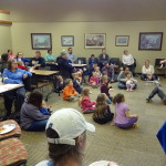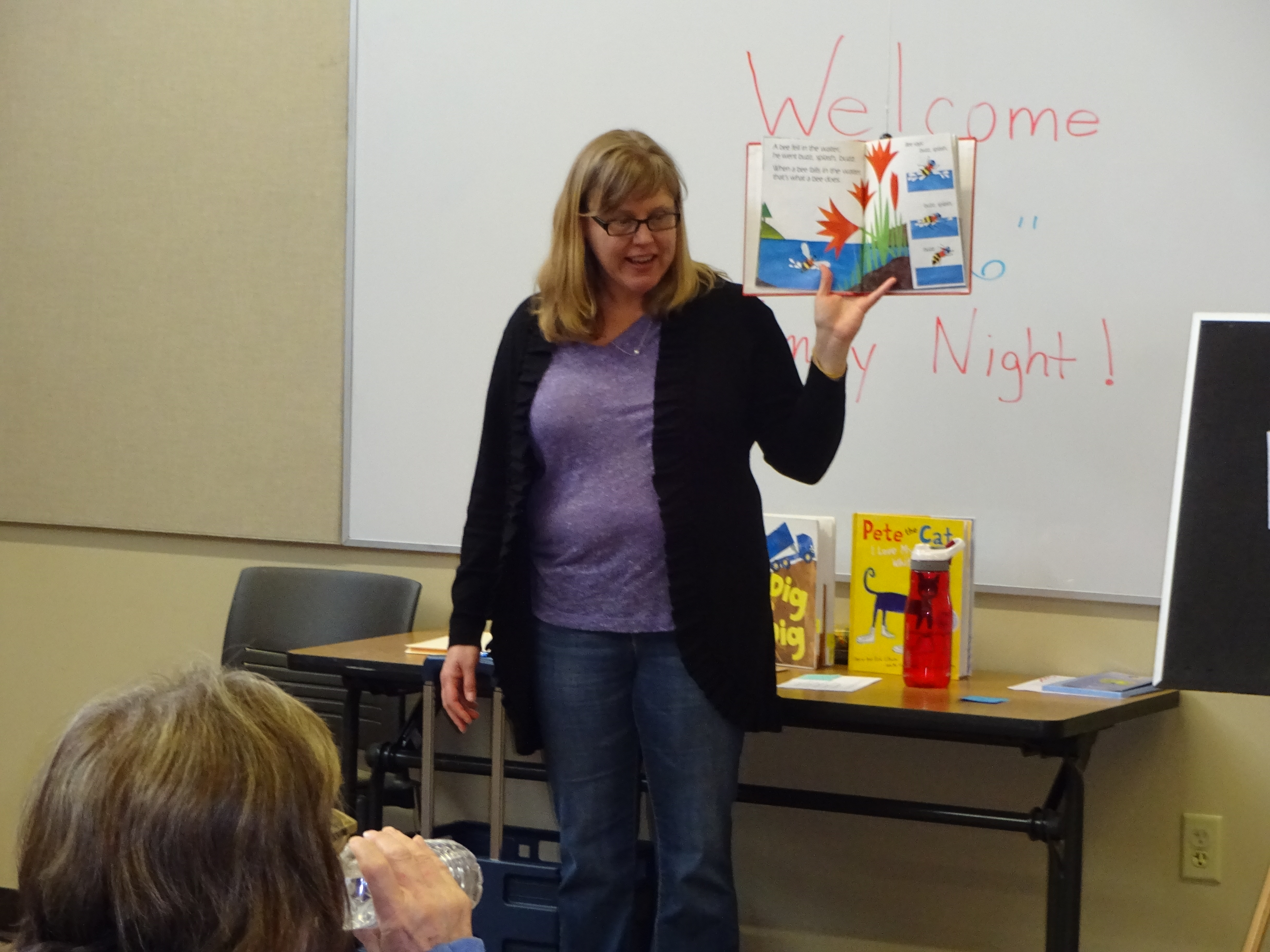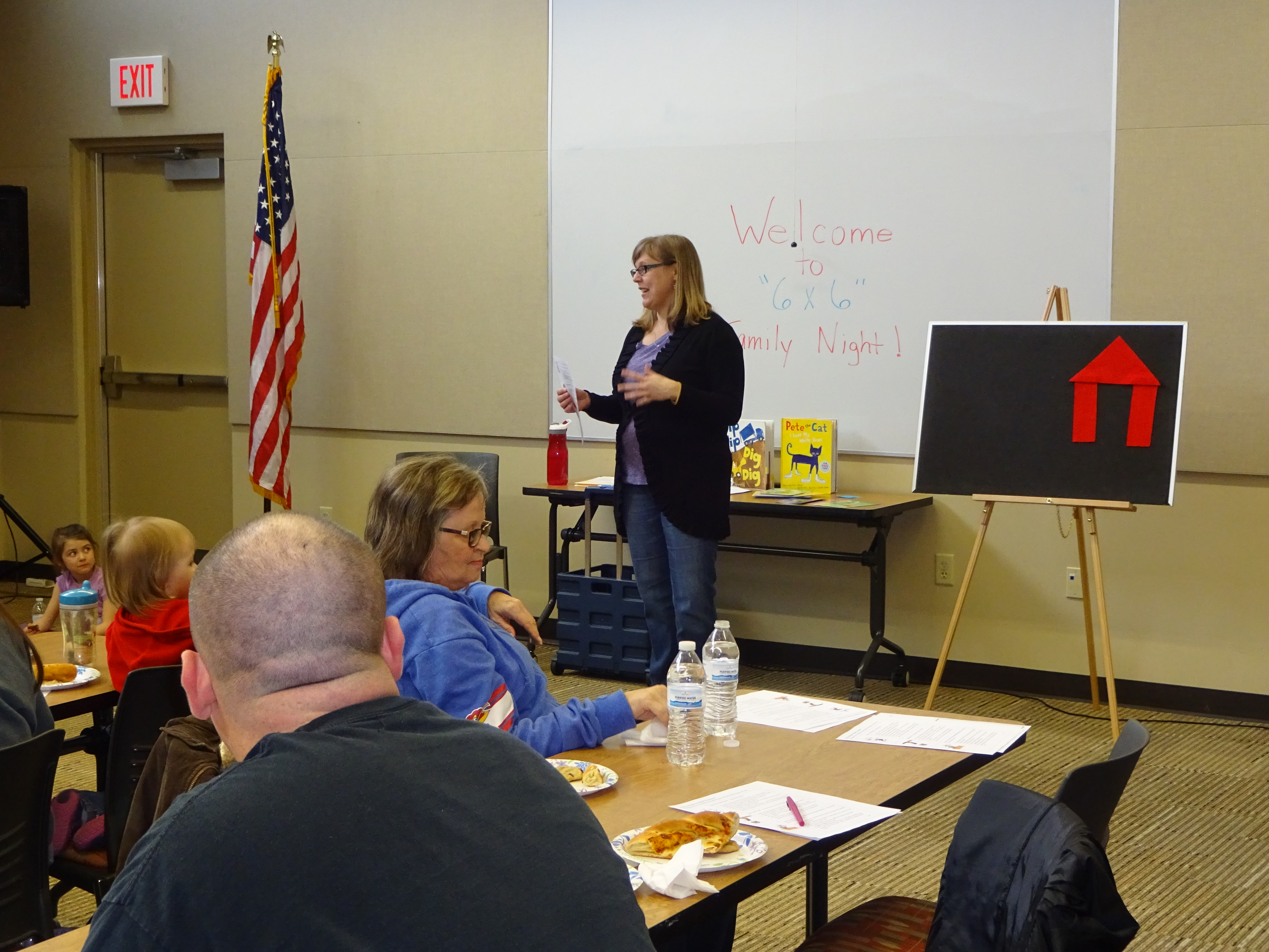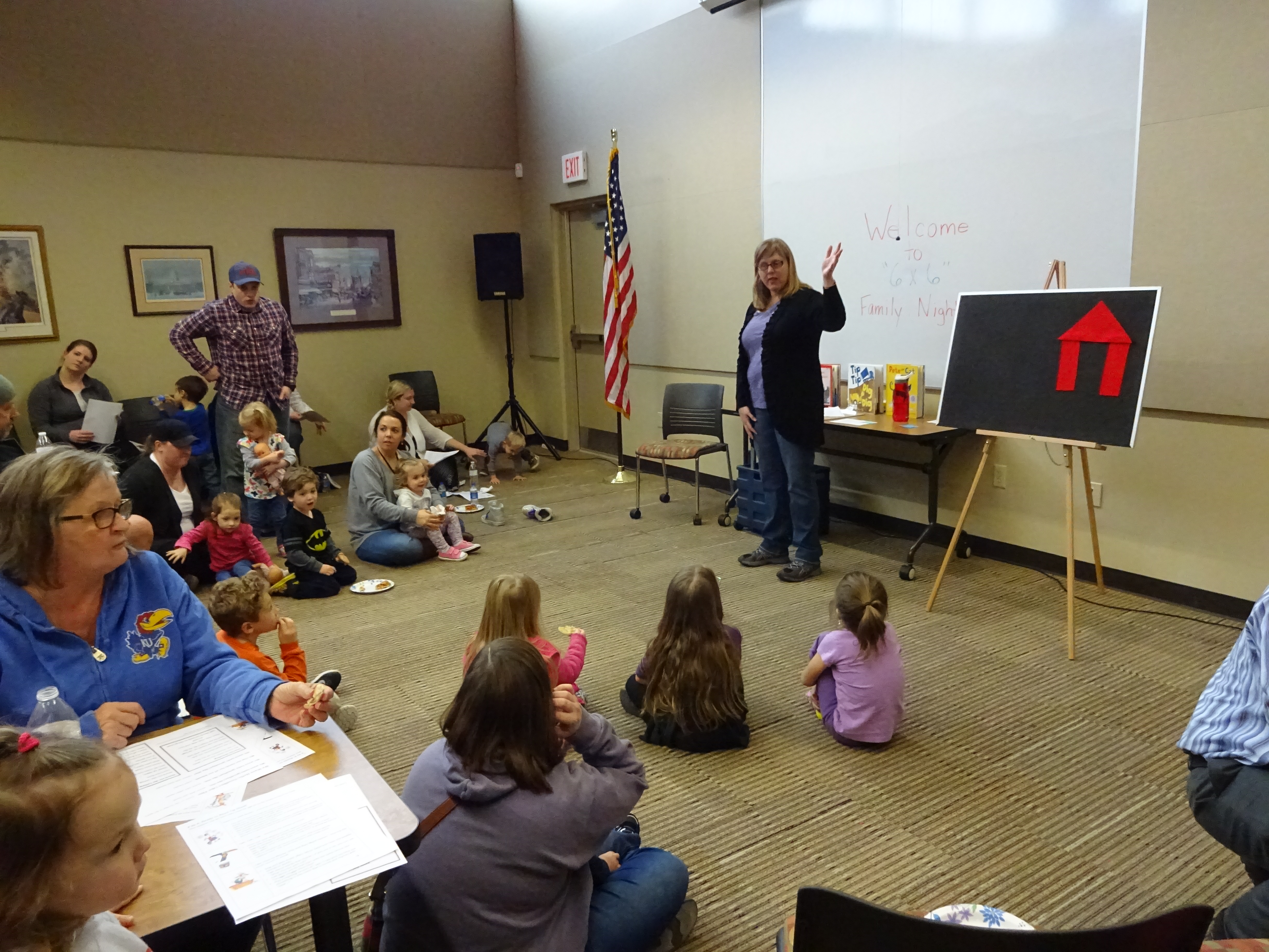 The 6​ by ​6 Family Reading Workshop, held at the Bonner Springs City Library on 3/24, was a HUGE success! We started at 5:30pm with 45 in attendance, including families from the USD204 Parents as Teachers group, as well as a good number of our own patrons. “6​ by ​6” refers to 6 skills that parents can teach their children by age 6, which will help make them better readers. Our presenter, Anna Foote, helped to develop this program while she worked in the Johnson County Library system, ​and ​later, while working at the State Library of Kansas, she helped to implement these skills throughout Kansas libraries. Anna presented the 6​ by ​6 skills to the parents while we enjoyed pizza ​and​ cookies (provided by ​the ​Friends​ of the Library​), then she did a story time for the children and demonstrated the 6 skills as she read. We made our collection of 6​ by ​6 literacy kits available in the meeting room for patron checkout, ​and ​​​many of them were checked out that night.