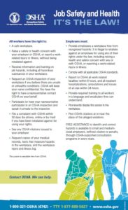 These posters all concern the rules and regulations of employment and contain information from government agencies like the Occupational Safety and Health Administration (OSHA), the Department of Labor (DOL) Wage and Hour Division (WHD), and the National Labor Relations Board (NLRB).